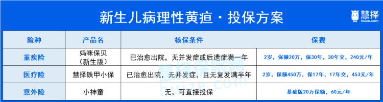 尤其是生理性黃疸已痊愈的足月兒,重疾險、醫(yī)療險均可以標(biāo)準(zhǔn)體承保,如媽咪保貝(新生版)少兒重大疾病保險、慧擇鐵甲小保少兒長期醫(yī)療險;