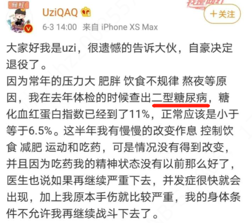 去年,電競選手UZI也因為身體原因退役了,糖化血紅蛋白超出了快一倍。