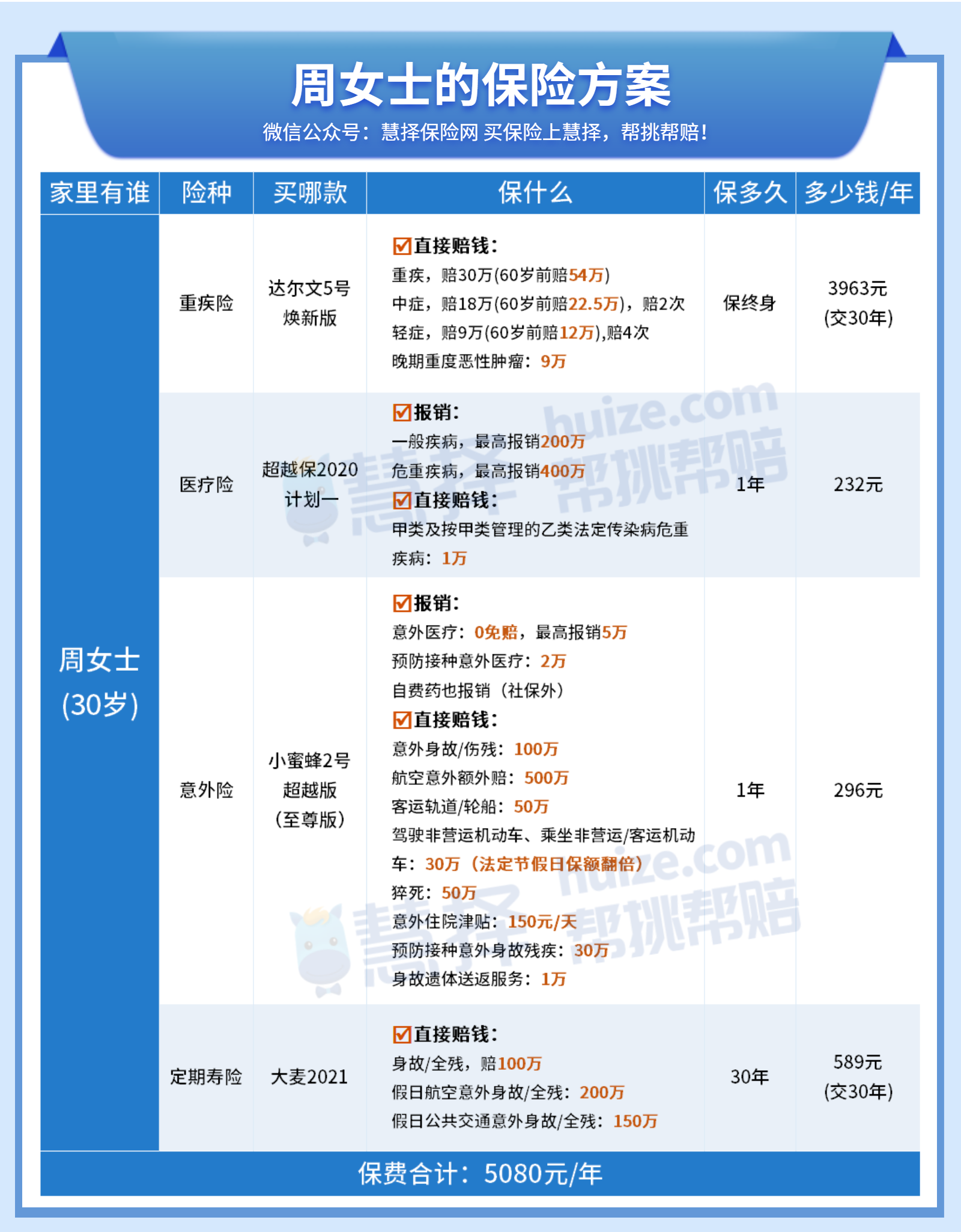 整套方案一共要5080元/年,在周女士的預算內,能獲得一份不錯的保障。