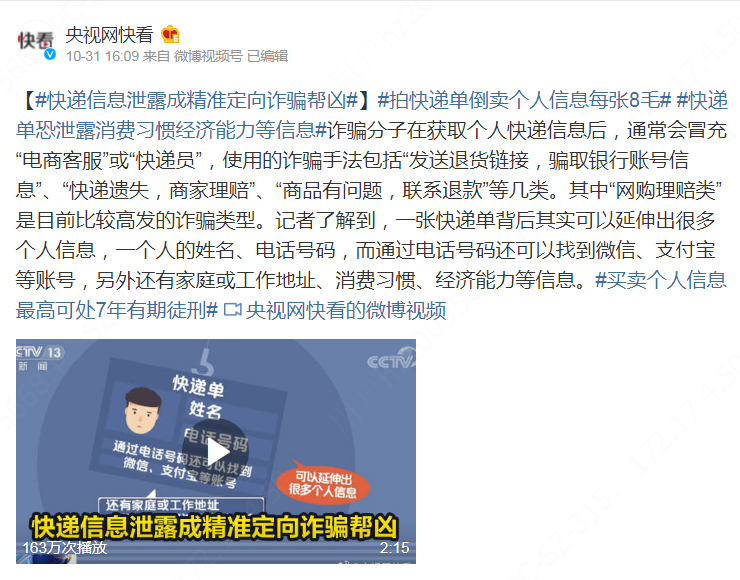 昨天熱搜上,央視曝光了一起有關快遞信息的詐騙案↓
