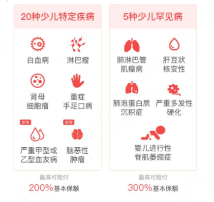 20種少兒特疾額外賠100%;5種罕見病額外賠200%